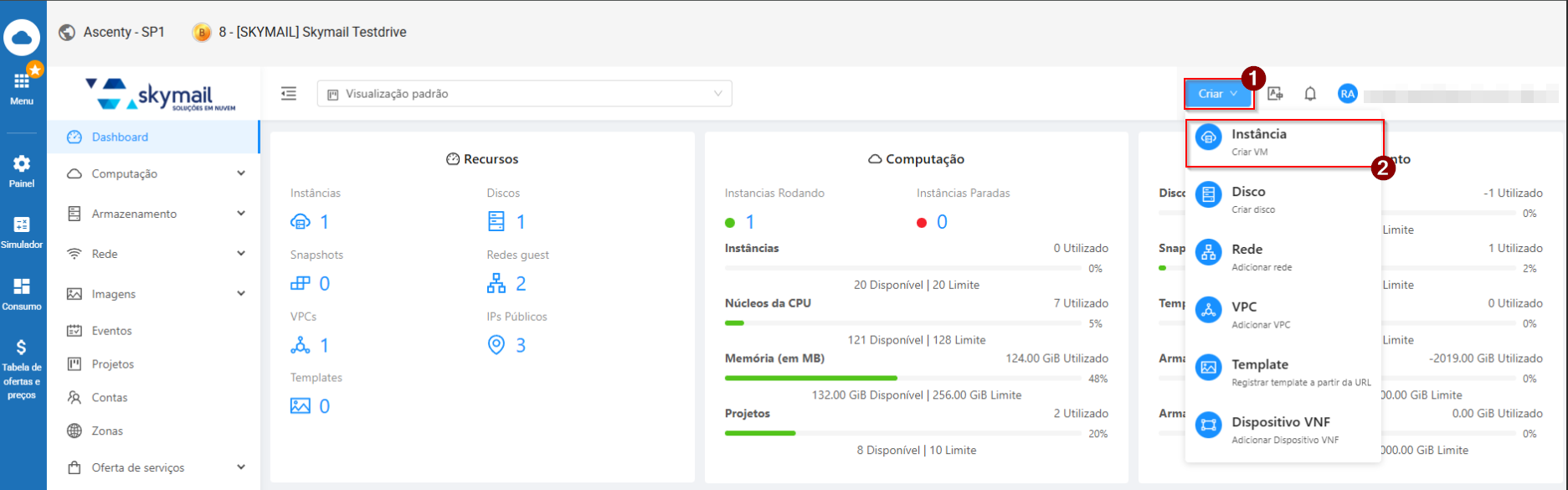 Passe o mouse por cima do botão "Criar", e selecione a opção "Instância".