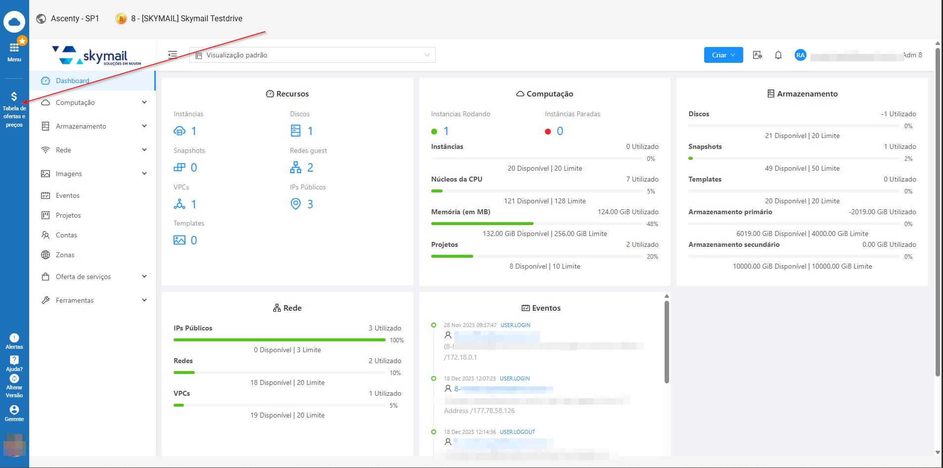 Importante: A adição de recursos de cloud via painel de controle, pode resultar em aumento dos valores mensais atualmente cobrados. Em caso de dúvidas, consulte a tabela de preços de cloud (Imagem abaixo), ou entre em contato com o departamento comercial.