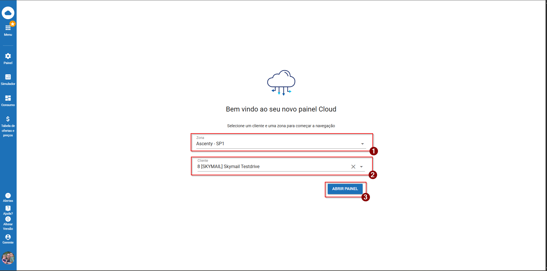 Selecione uma Zona para criação do ambiente, indique o cliente e clique em abrir Painel: