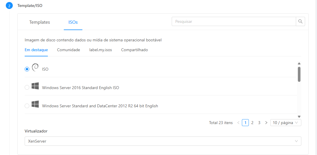 ISO: Diferente de um Template pronto, se desejar instalar o sistema operacional a partir de uma imagem, é possível selecionando a opção ISO.