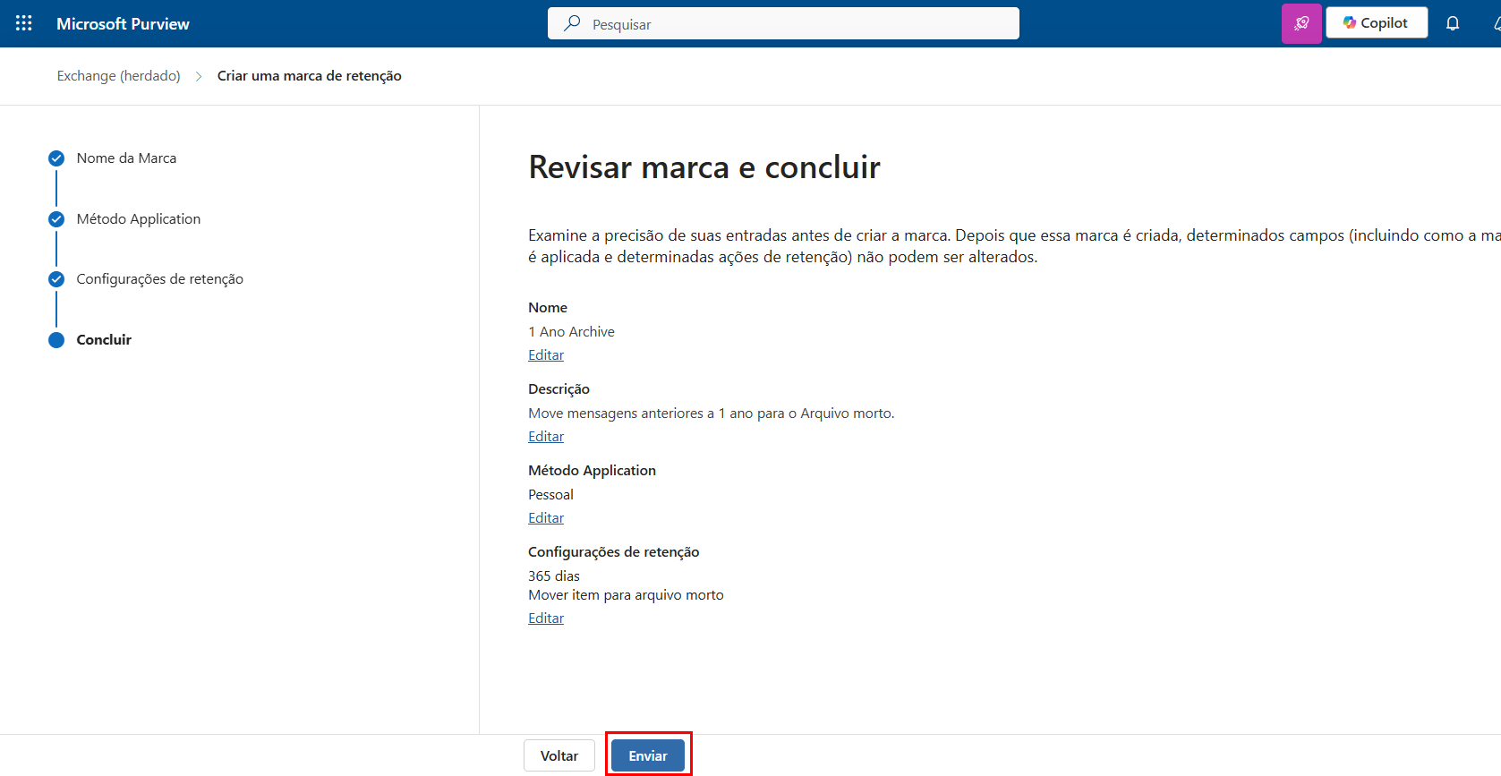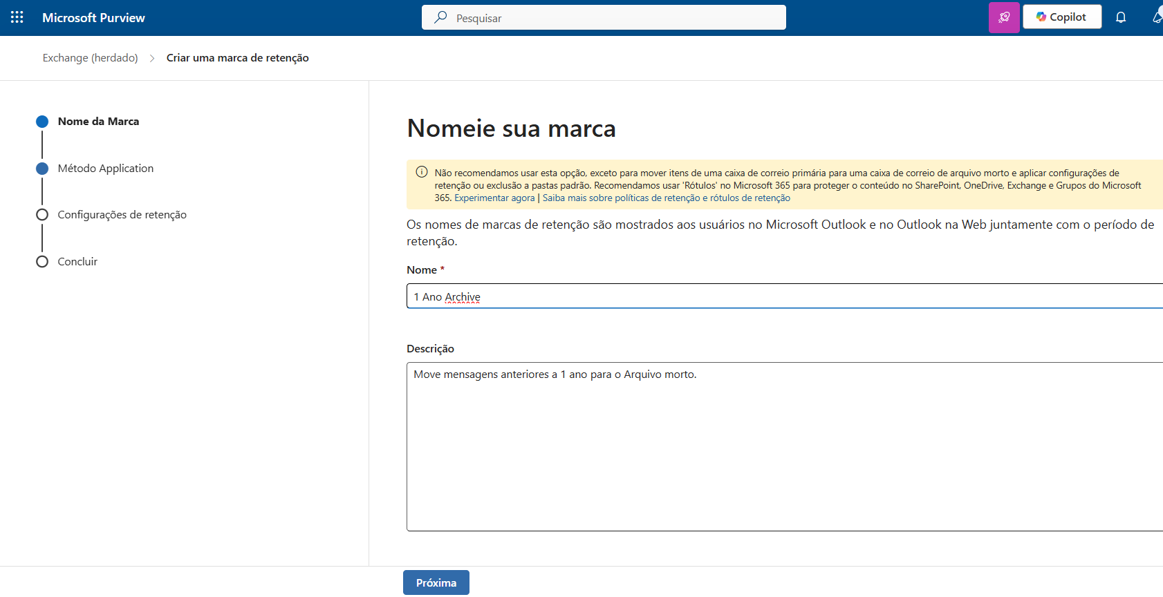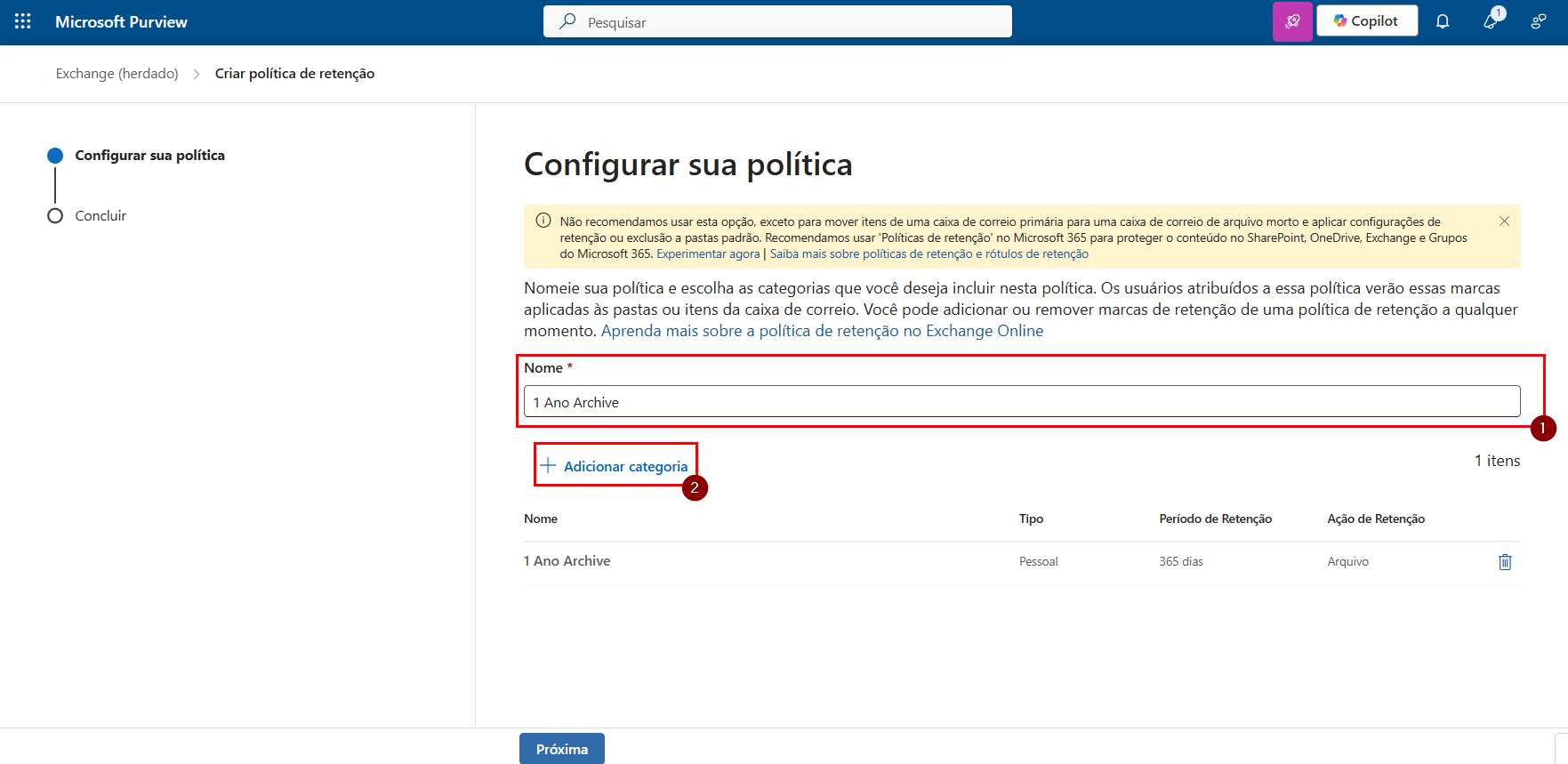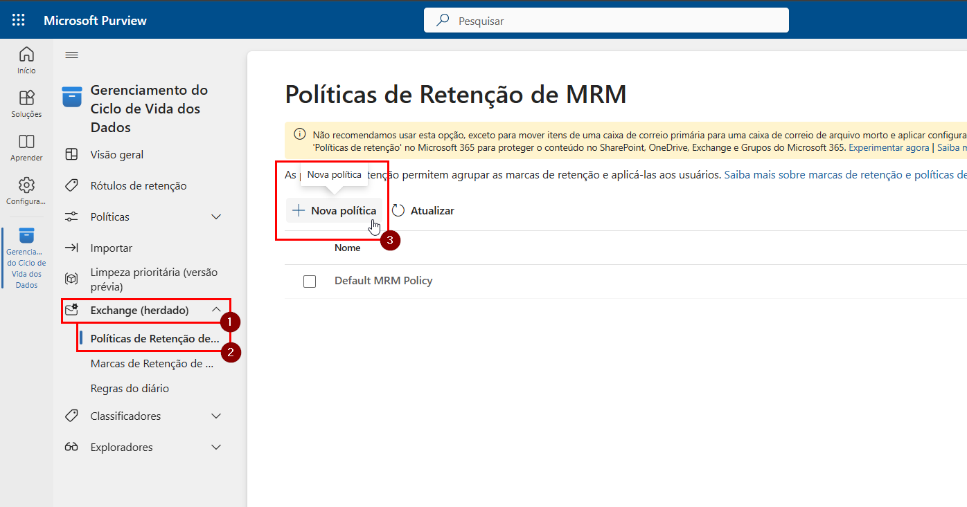 8. Agora vamos criar a Politica de retenção de fato, volte em Exchange (herdado) > Politicas de retenção de MRM: