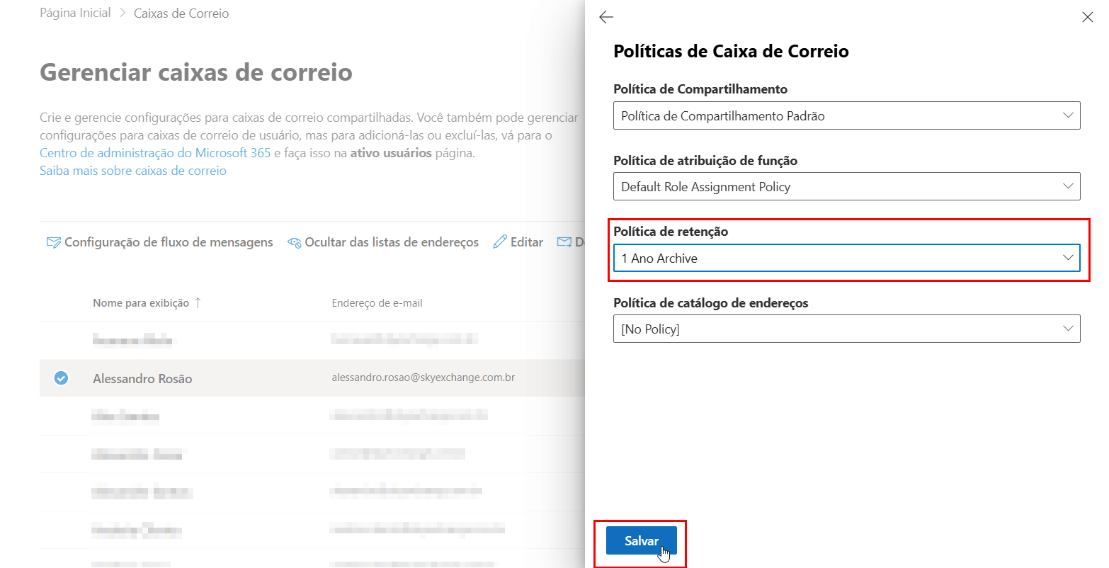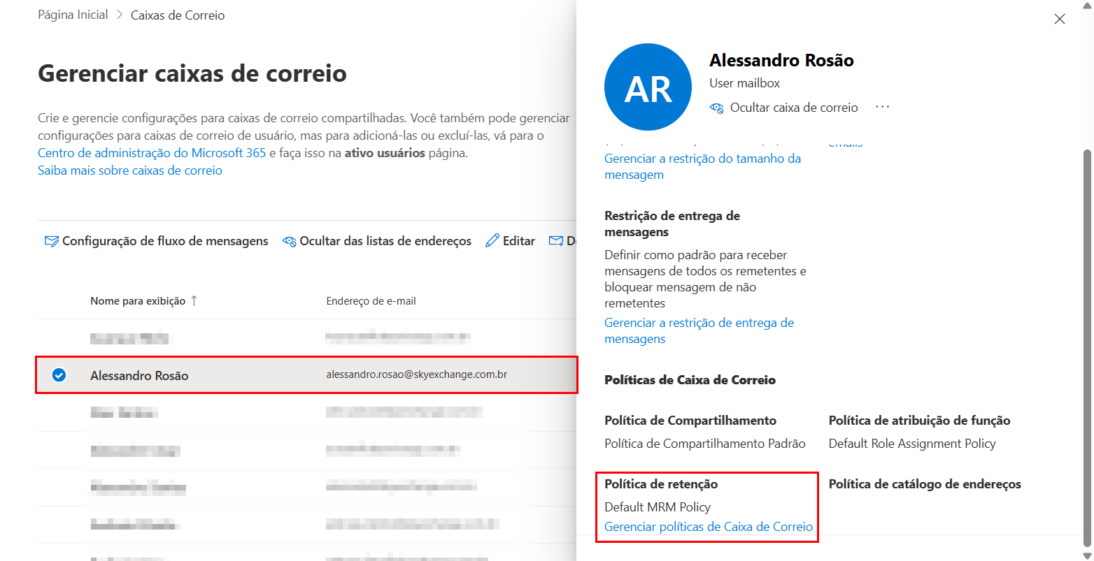 10. Com a politica já criada, volte ao painel do Exchange, selecione a conta na qual deseja aplicar a politica, vá até Caixa de Correio > Politica de retenção: