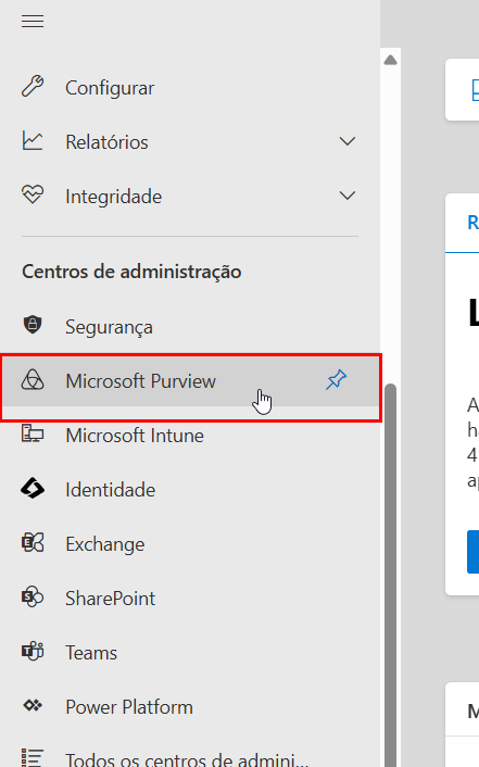 1. Logue no Tenant do cliente > Centro de Administração > Purview (antigo Compliance):