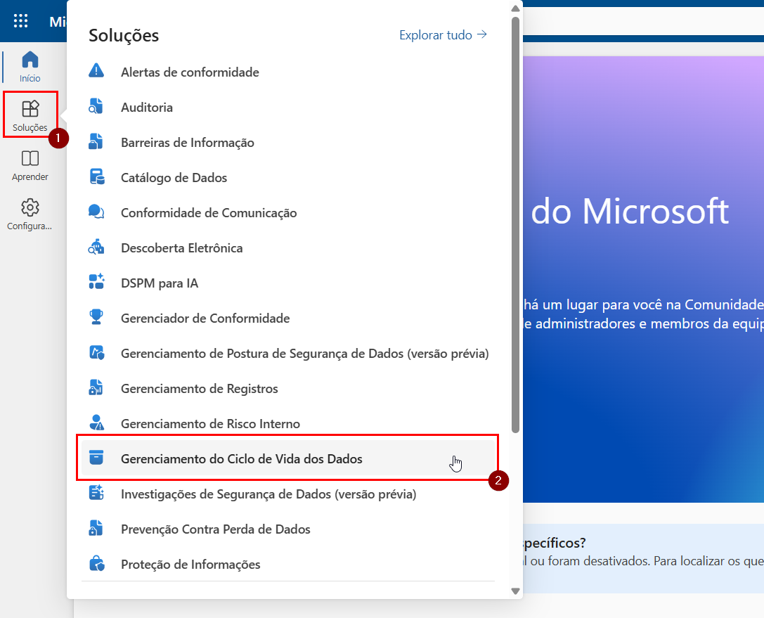 2. Procure o campo Soluções e encontre o campo Gerenciamento do Ciclo de Vida dos Dados: