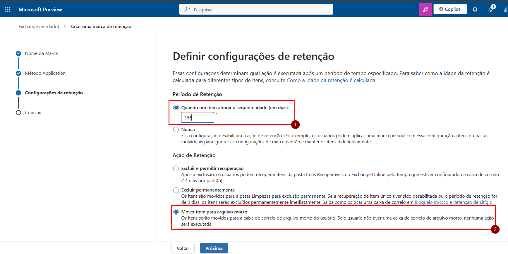 Criando políticas de retenção para automatizar a transferência de e-mails para o arquivo morto do Exchange Online