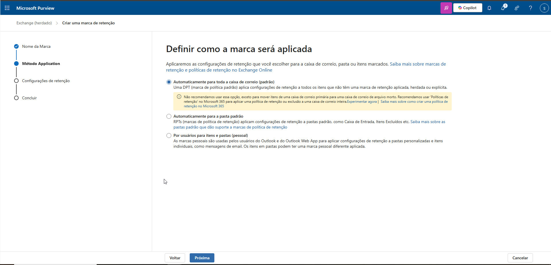 Para criar uma politica de retenção padrão, siga os passos abaixo: