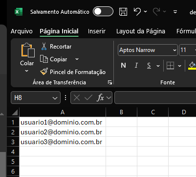 O arquivo CSV é simples, onde cada linha contém um único endereço de e-mail. Exemplo: