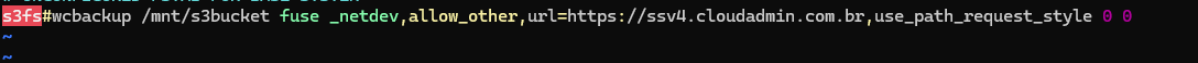 s3fs#<BUCKET_NAME> /mnt/s3bucket fuse _netdev,allow_other,url=<URL>,use_path_request_style 0 0