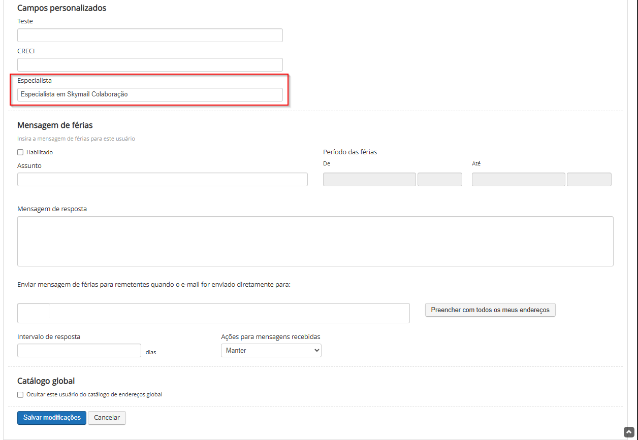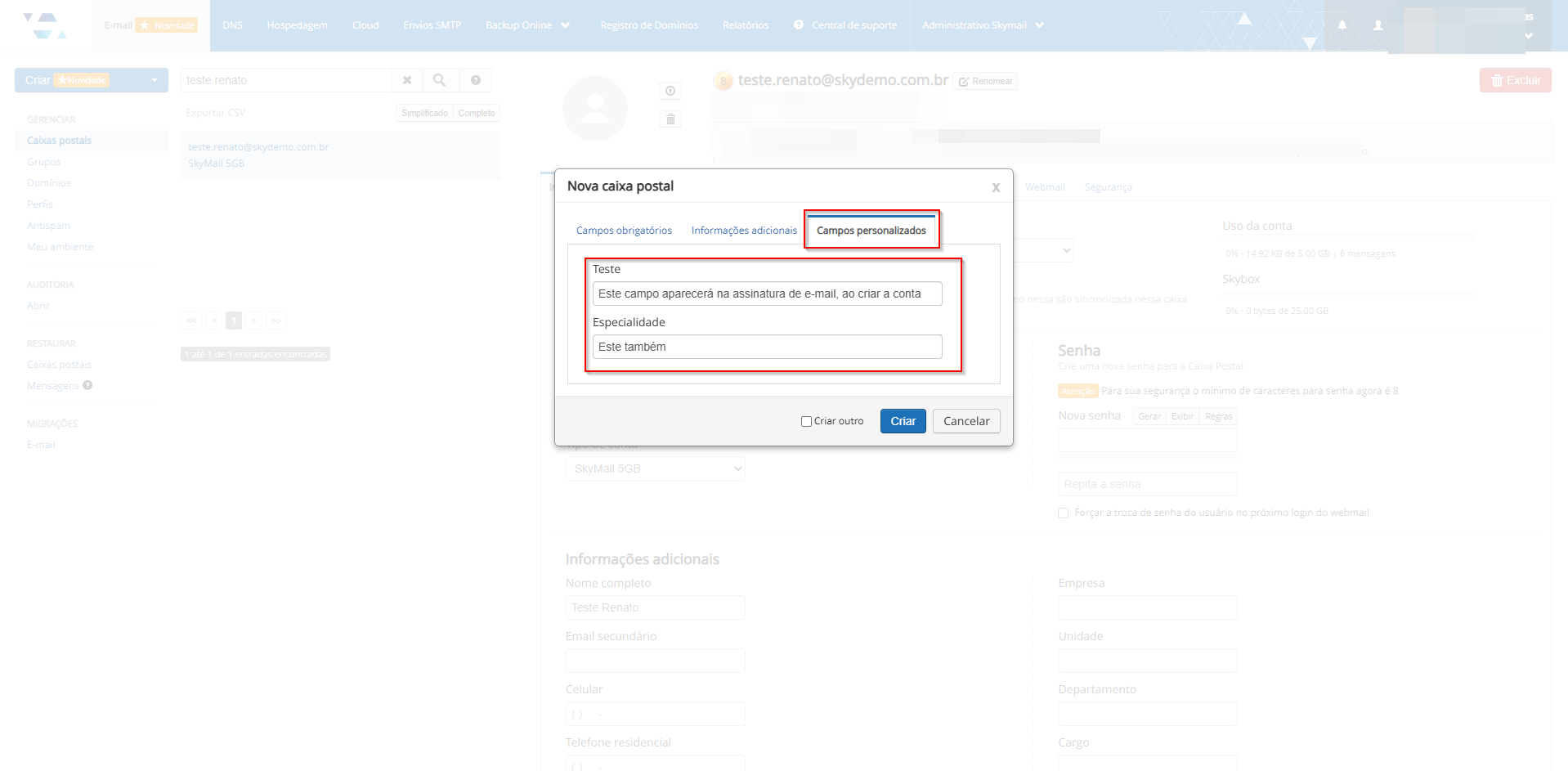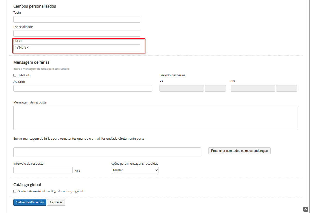 Crie ou edite uma caixa postal vinculada ao domínio, neste momento você deverá acrescentar conteúdo ao campo personalizado CRECI.