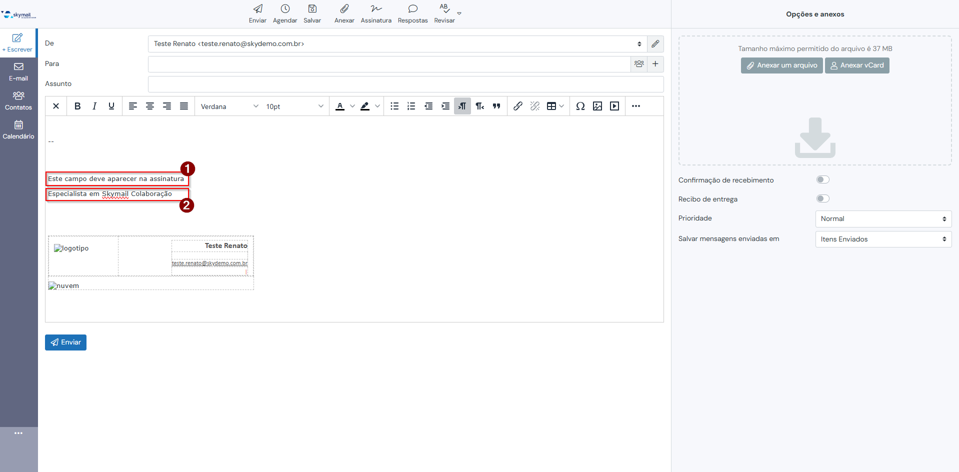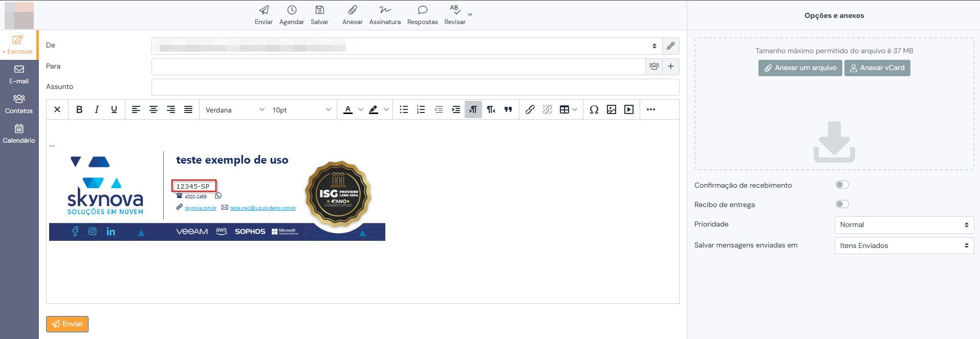E ao adicionar conteúdo aos campos personalizados, seja na criação ou edição de uma caixa postal, as assinaturas serão exibidas com a informação adicionada, conforme imagem ilustrativa a seguir.
