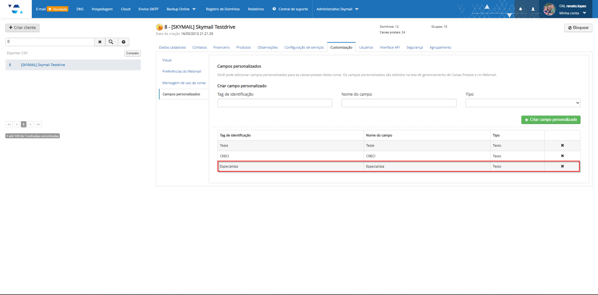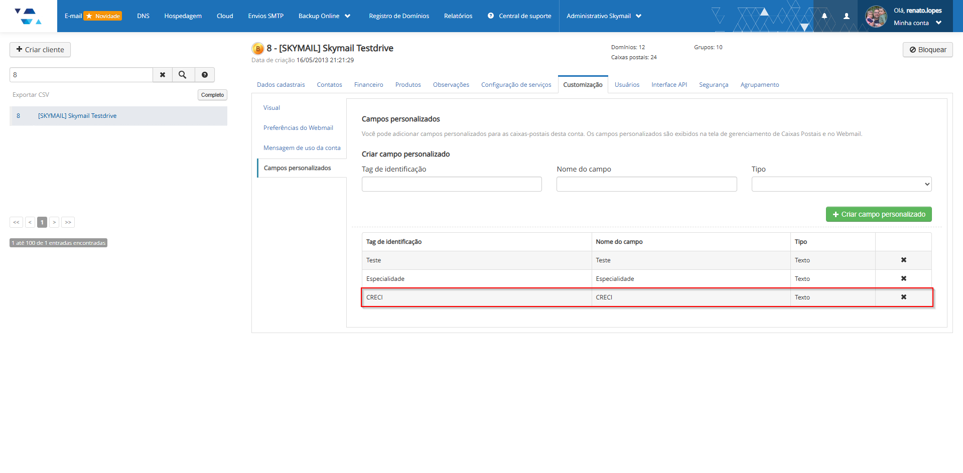 Ponto importante, a criação dos campos personalizados é feita pelo administrador na área do cliente em "Customização > Campos personalizados".