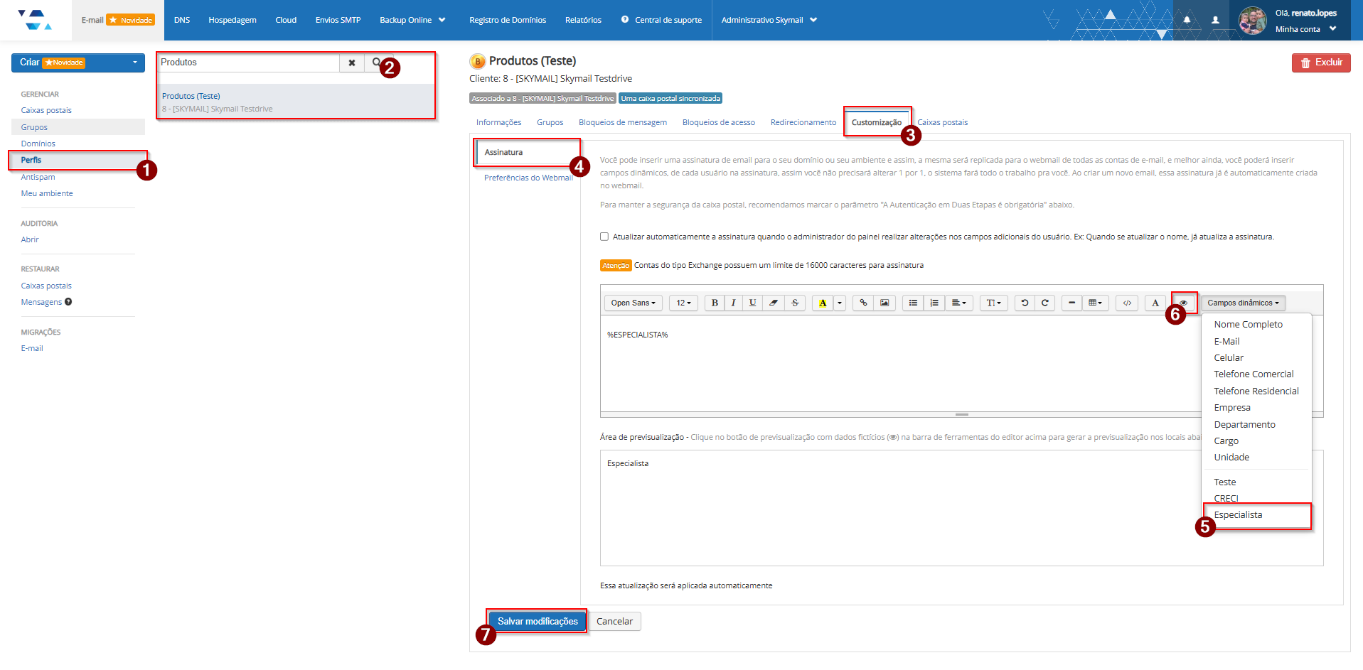 Adicionando campos personalizados em assinaturas de E-mails vinculados a perfis: