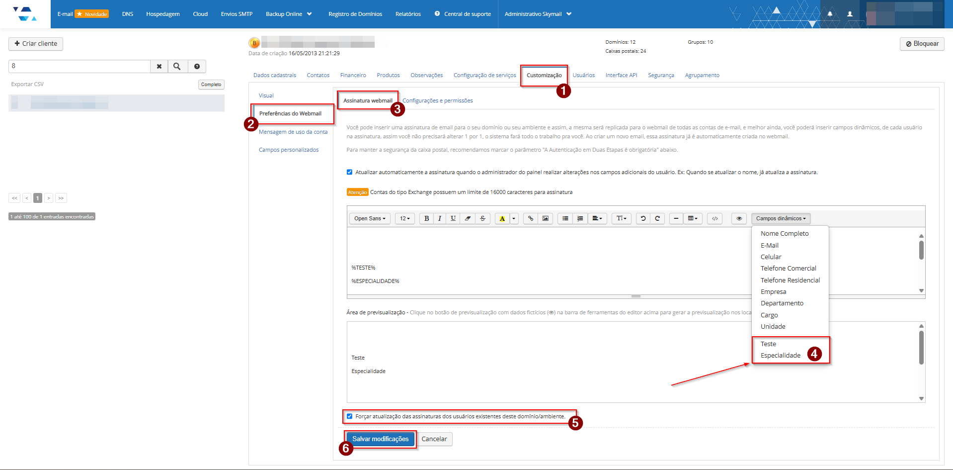Faça a inclusão dos campos personalizados nas assinaturas dinâmicas a nível de Domínio do cliente: