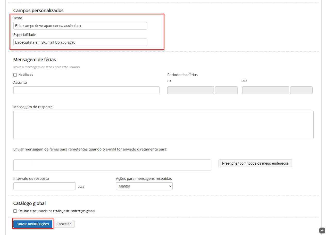 Ao aplicar o passo ilustrado abaixo, o administrador definirá que os campos personalizados serão incluídos nas assinaturas de todas as caixas postais da organização. (lembrando que essa sincronização será feita somente para webmail).