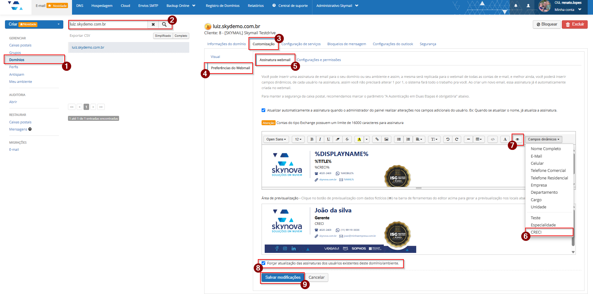 Adicionando campos personalizados em assinaturas de E-mails apenas para o domínio: