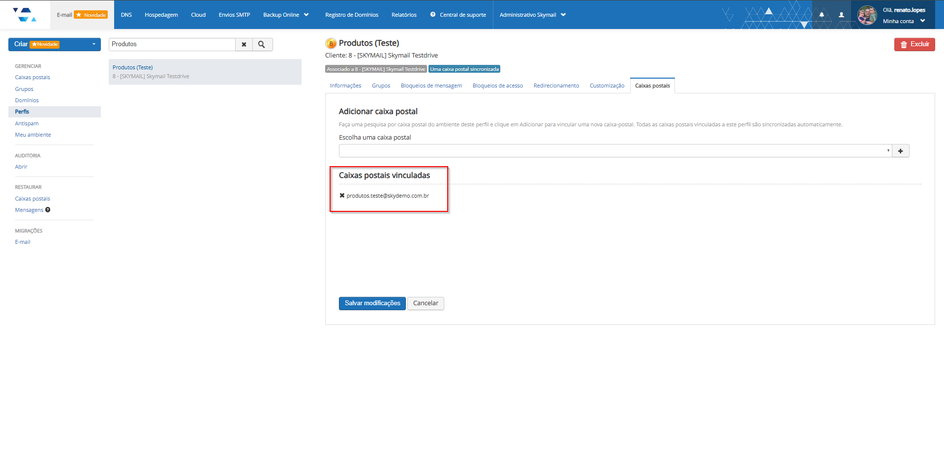 Criamos um perfil teste denominado "Produtos", vincule as caixas postais do setor conforme exemplo abaixo: