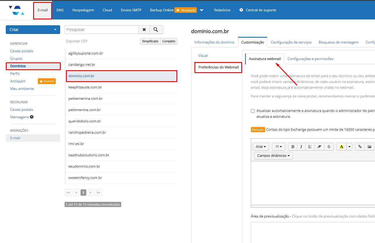 No painel à direita, entre em Customização → Preferências do Webmail.