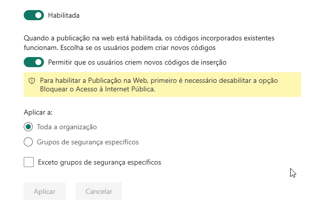 Quando ativada, os usuários podem criar esses links públicos diretamente pelo Power BI.