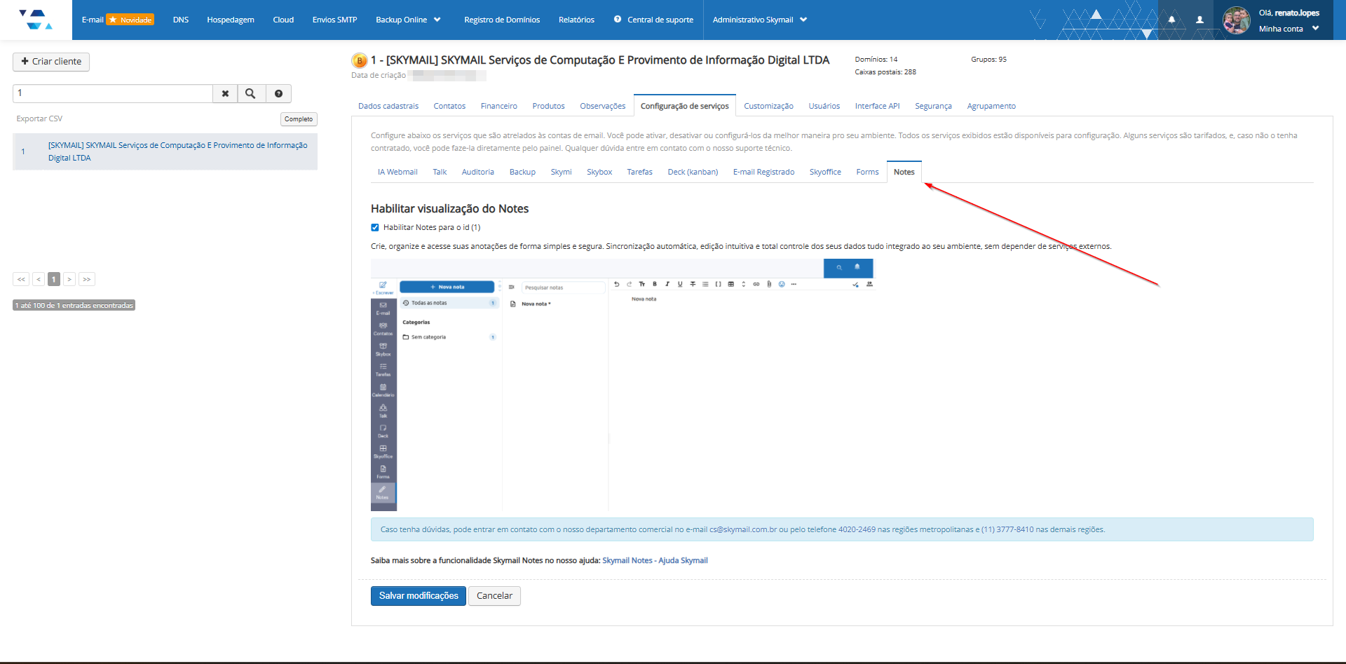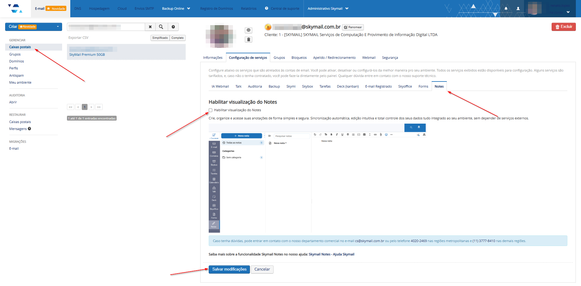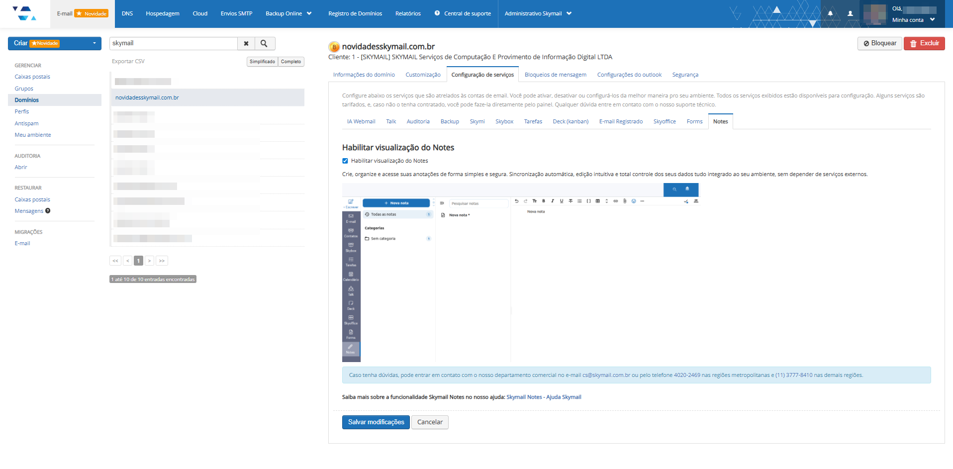 Caixa postal individualizada: O administrador poderá definir se cada caixa postal terá acesso ao Notes. Porém, ao ativar nas camadas Organização ou Domínio, todas as caixas postais serão habilitadas. Para desativar individualmente, basta acessar a configuração de serviço da caixa postal no Painel de Controle.