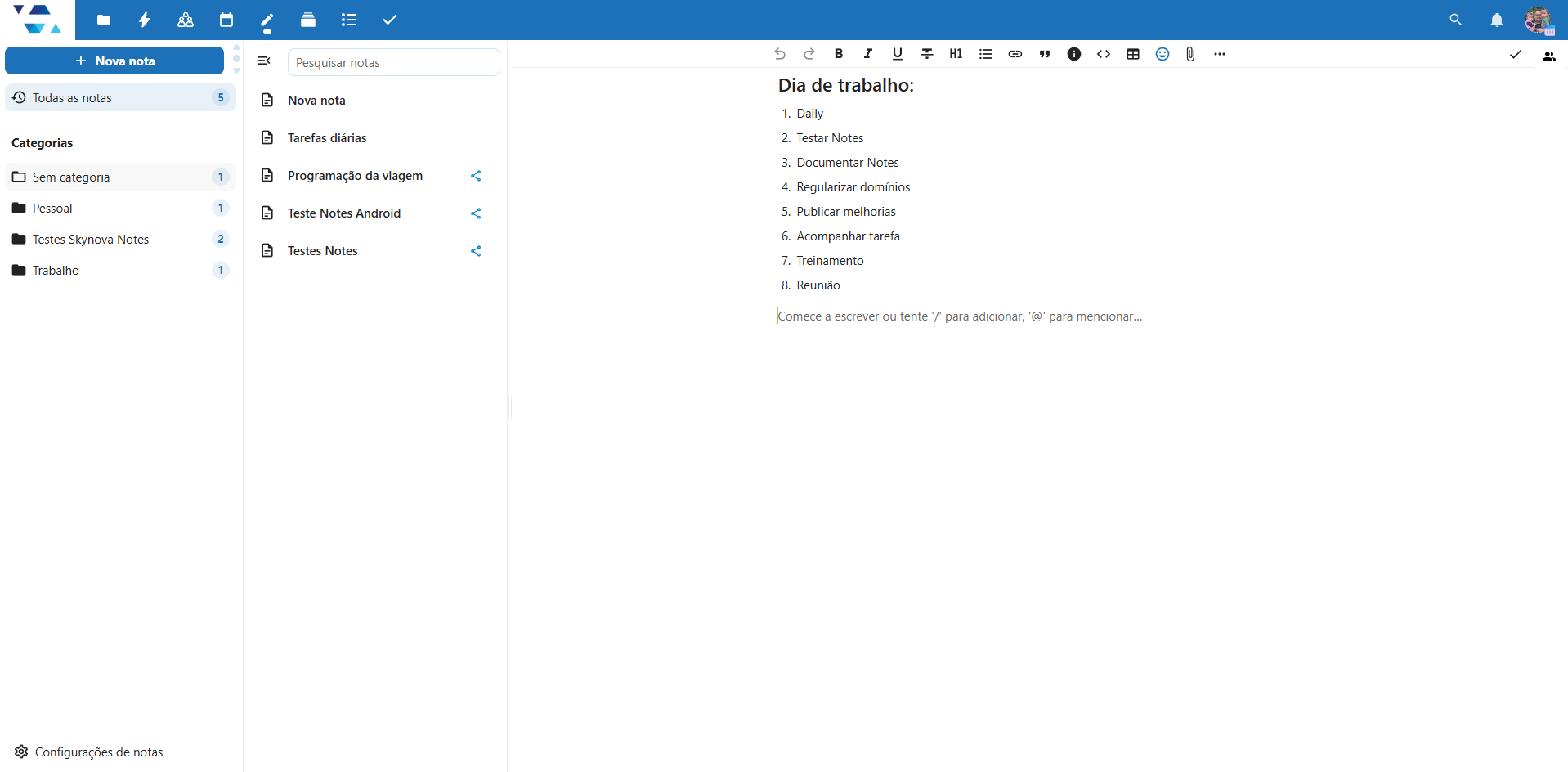 O Notes é uma funcionalidade integrada à plataforma Skymail de Colaboração que permite criar, organizar e compartilhar anotações de maneira simples, intuitiva e segura.