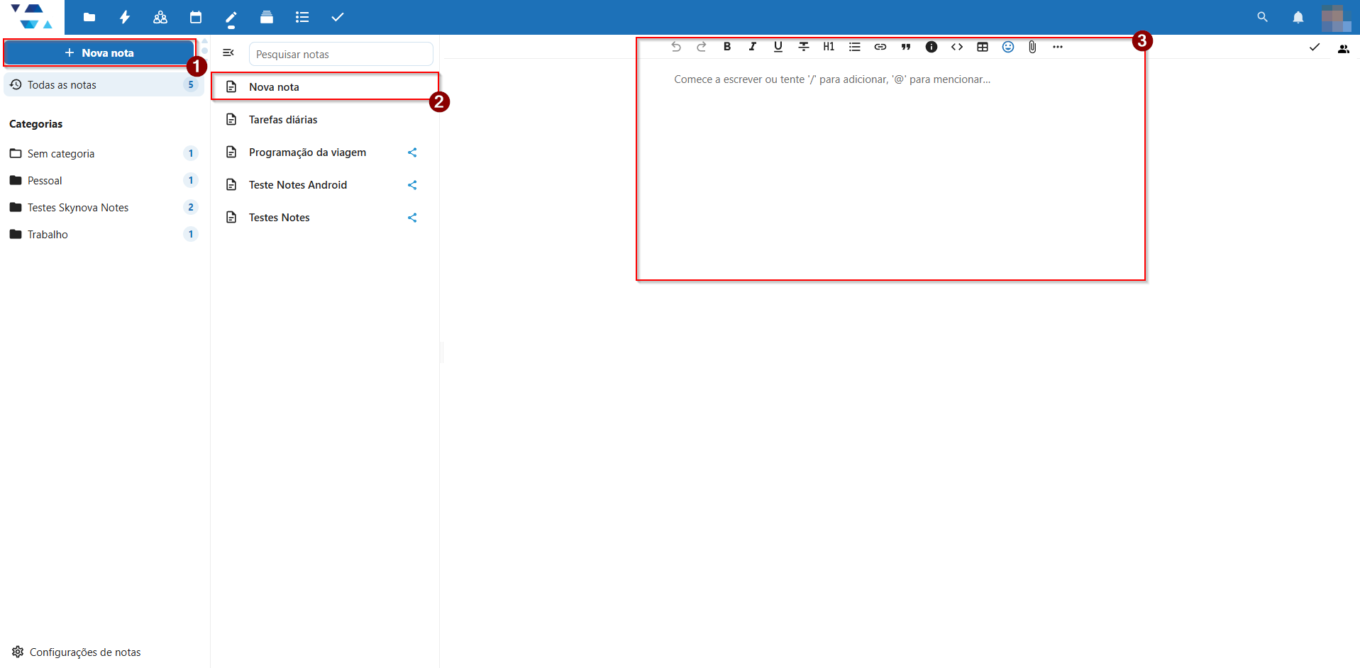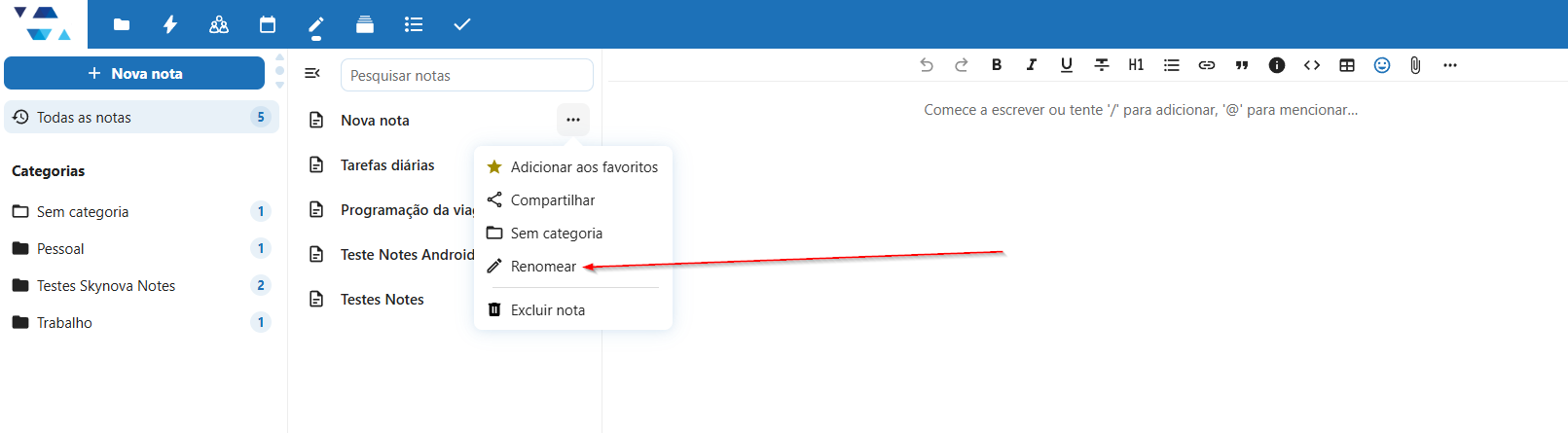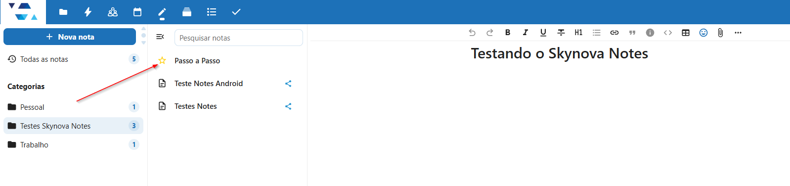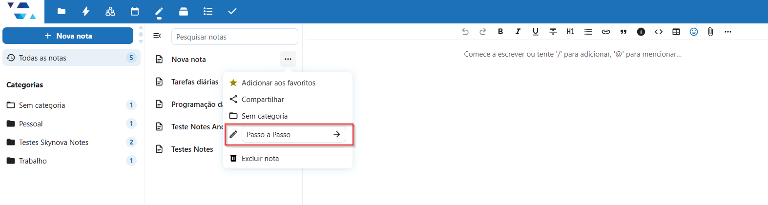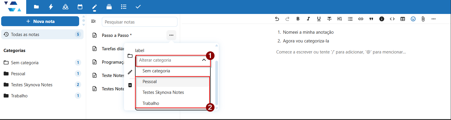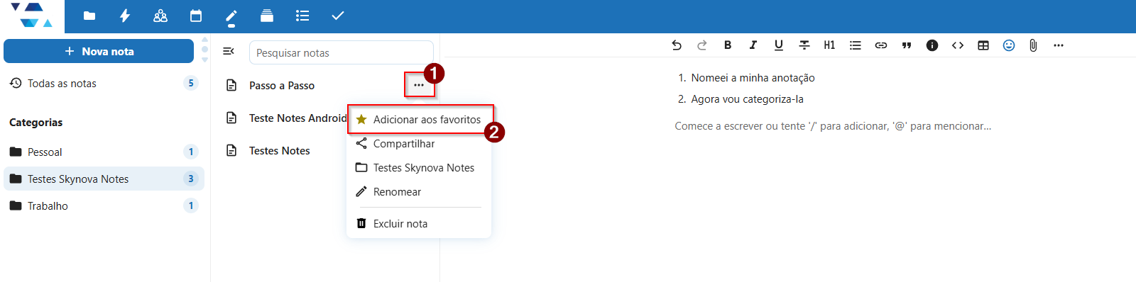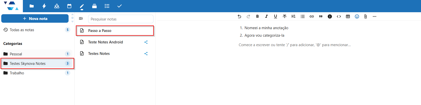 A partir do momento em que se aciona o botão para criar nota, e gera conteúdo a ela, a nota já está criada. Nos passos seguintes as instruções serão para organizar as anotações.