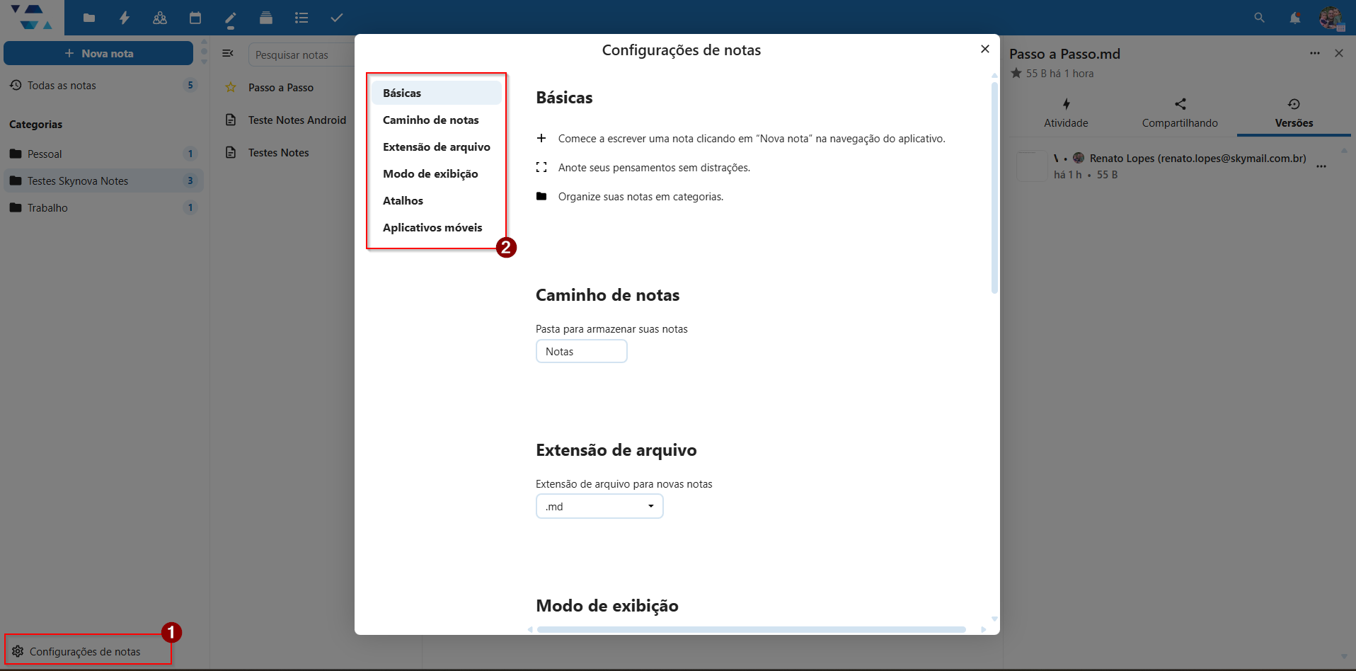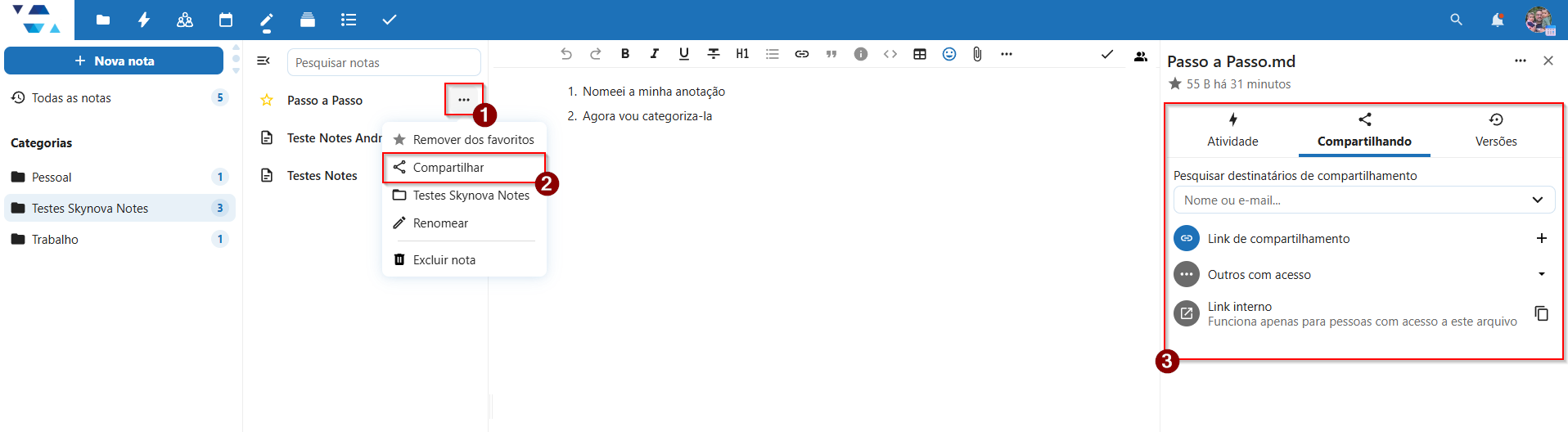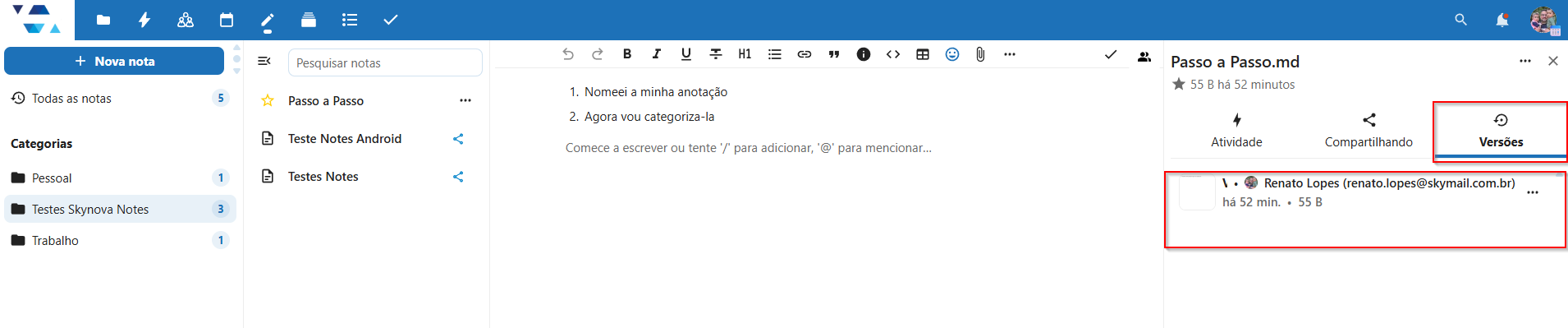 No mesmo local de compartilhamento, o usuário terá acesso a aba "Versões" que apresentará todas as versões salvas da anotação.
