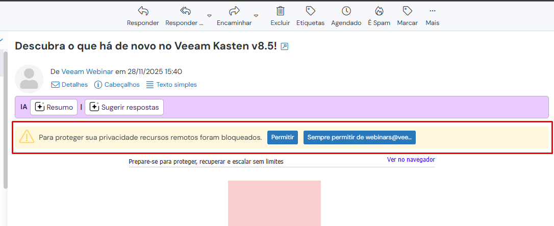 Alguns e-mails podem exibir o aviso “Para proteger sua privacidade, recursos remotos foram bloqueados”.