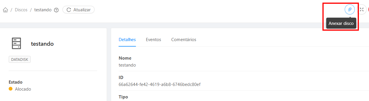 5. Depois de selecionar o disco, na parte superior a direita aparece a opção de anexar conforme imagem abaixo.