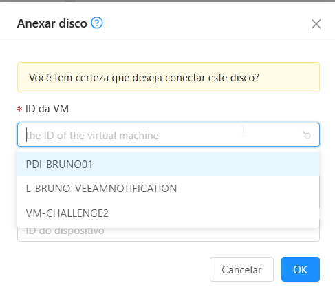 6. Selecione a vm que deseja anexar o disco e clique em salvar.
