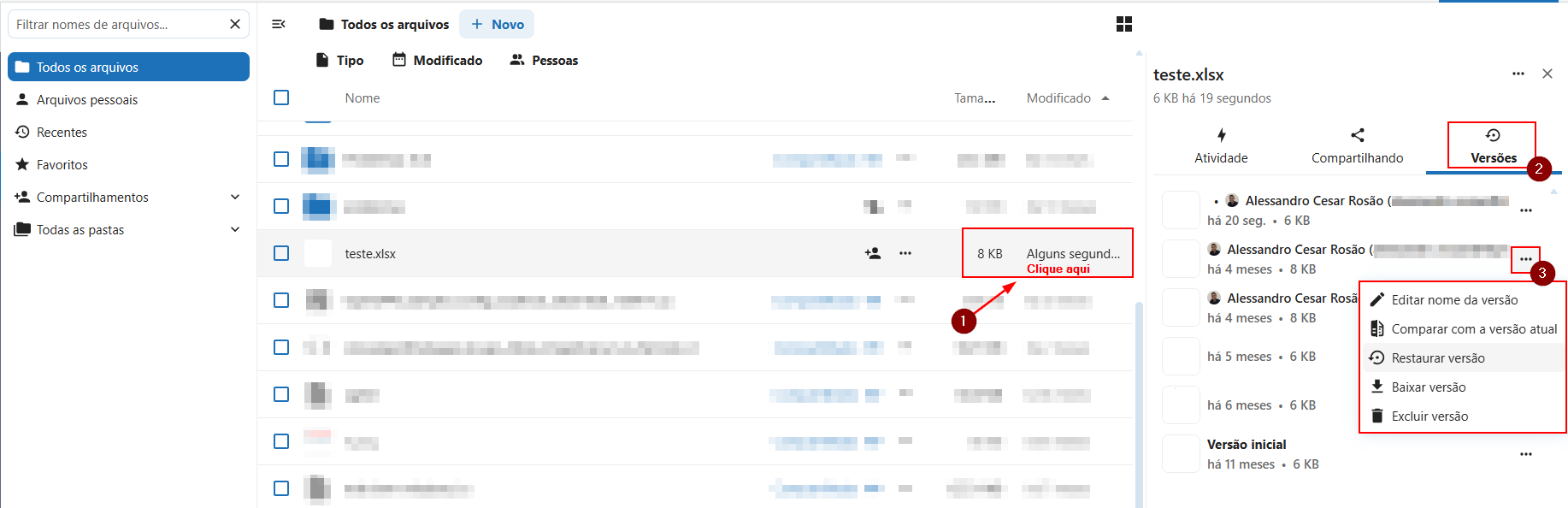 Para isso, vá no arquivo desejado > clique no campo onde informa sua data de modificação> Versões > Selecione a versão > Selecione a ação.