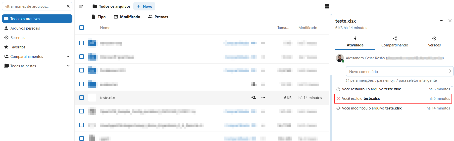 Após a restauração é possível ver o usuário que excluiu na aba "Atividade":
