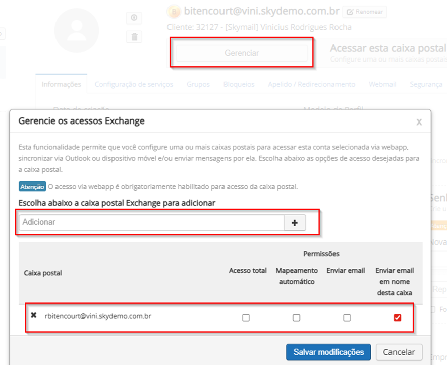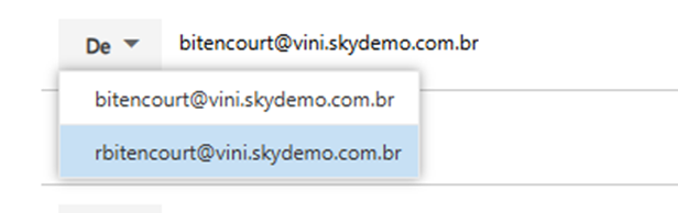 No exemplo abaixo, a conta rbitencourt@vini.skydemo.com.br possui permissão para enviar e-mails em nome da conta bitencourt@vini.skydemo.com.br.