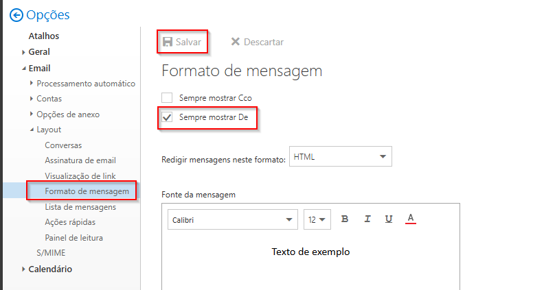 Concluída a configuração, acesse o Webmail, clique em Opções, vá até Layout → Formato de mensagem, selecione a opção “Sempre mostrar De:” e clique em Salvar.