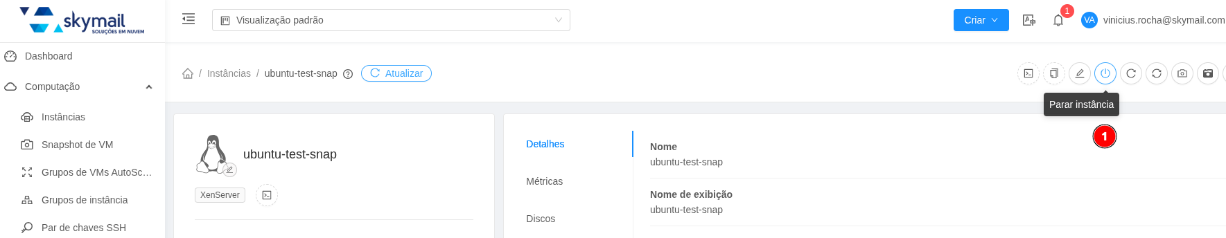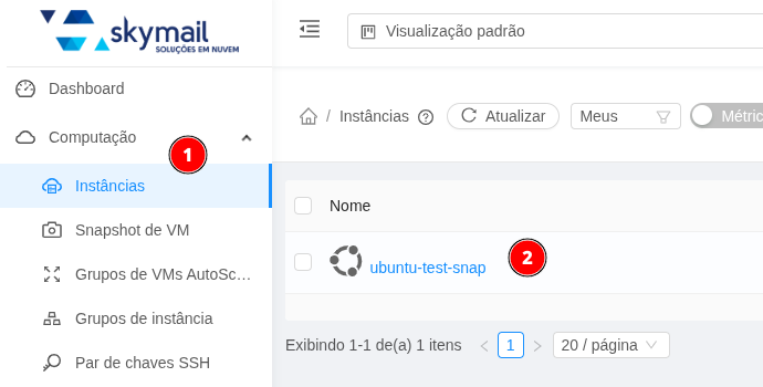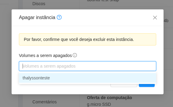 Dentro do painel selecione Computação -> Instâncias -> Selecione a VM que será excluida: