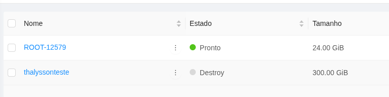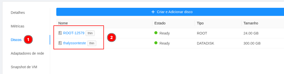 - O disco ROOT pode permanecer no estado Pronto porque ele está atrelado a VM, caso ela precise ser restaurada, o disco está pronto para ser restaurado junto com a VM. O disco de dados entra no mesmo estado Destroyed e pode ser recuperado em até 7 dias: