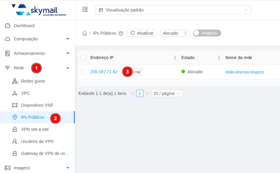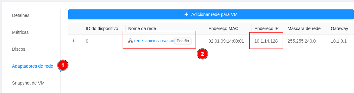 - Anote o nome do disco ROOT da VM e também o nome da rede e o IP que estão atrelados a ela, essas informações serão úteis depois: