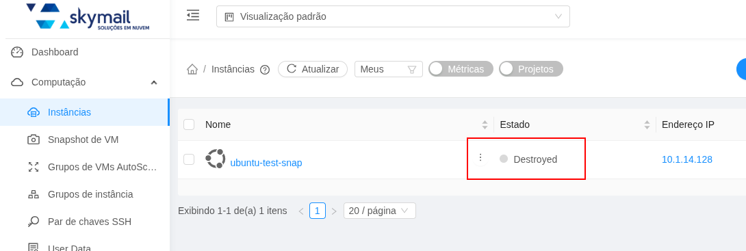 - Após executar a ação para apagar a instância, em alguns casos a VM pode ainda aparecer na lista de instâncias no estado Destroyed. Isso significa que ela foi excluída e permanecerá neste estado por 7 dias, podendo ser restaurada se necessário.