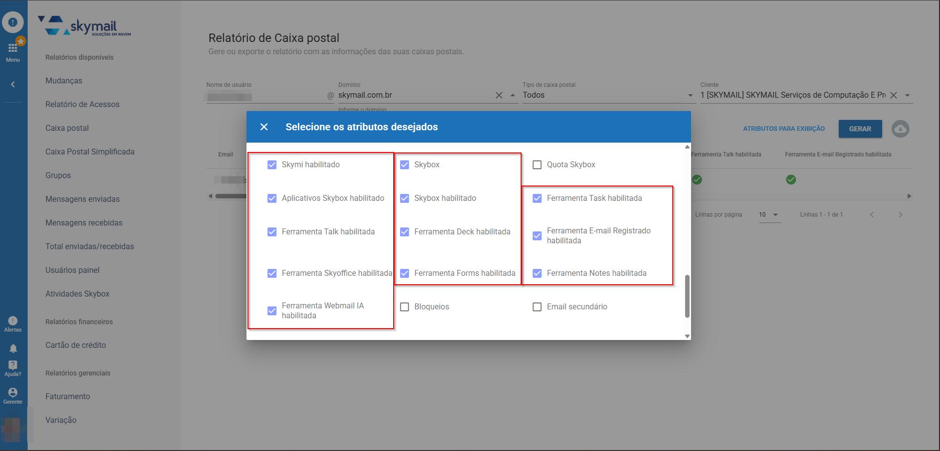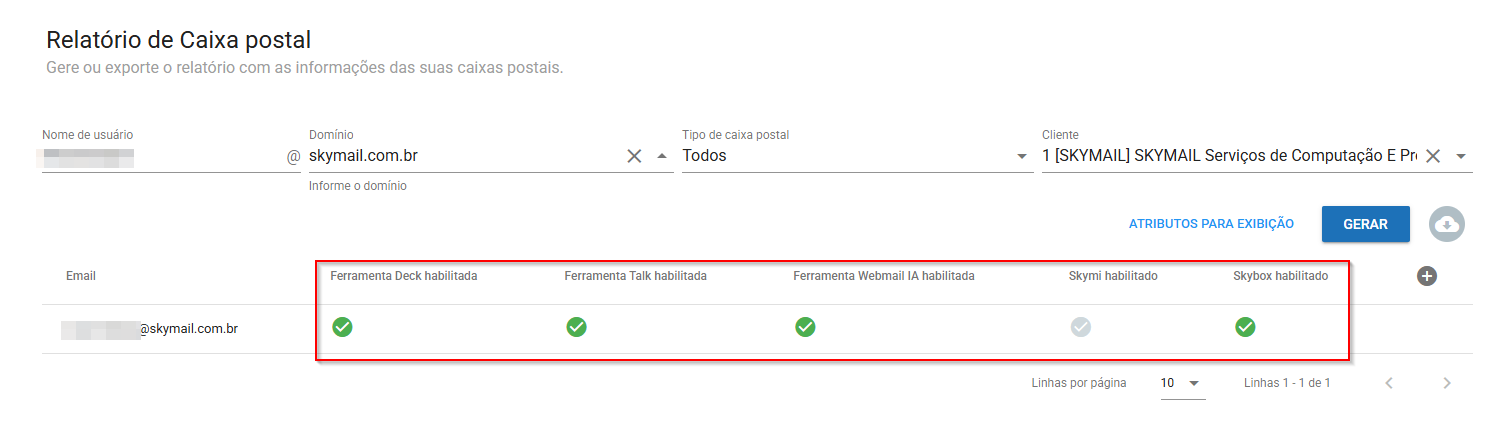 Ao gerar o relatório na tela, o status dos aplicativos é apresentado por meio de ícones de check: o ícone em verde indica que o aplicativo está ativo na caixa postal, enquanto o ícone em tom neutro sinaliza que o aplicativo está inativo.