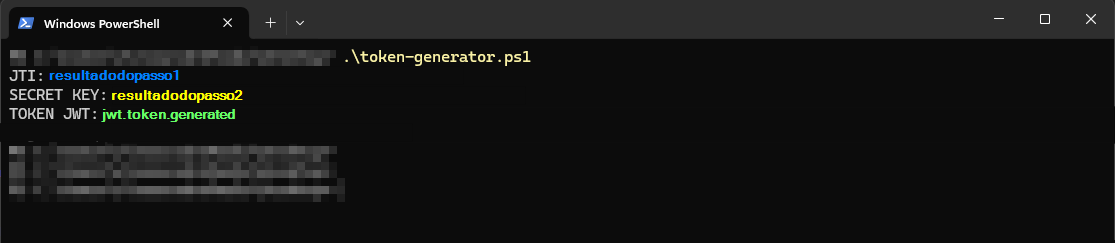 Após a execução ele irá solicitar o "JTI" juntamente com a "SECRET KEY" (Chave privada) que coletamos nos passos anteriores: Conforme a imagem acima o TOKEN será gerado com sucesso!