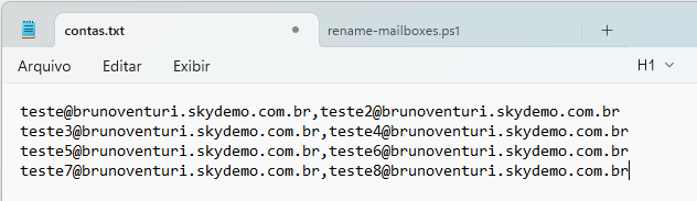 O arquivo TXT é simples, onde cada linha contém o e-mail antigo, seguido de uma "," e do novo e-mail. Esse arquivo deve estar NA MESMA PASTA em que o script rename-mailboxes-api.ps1 está e deve se chamar contas.txt.