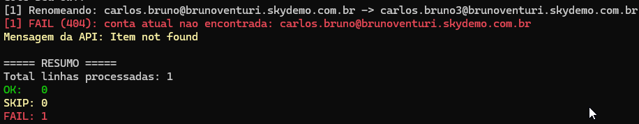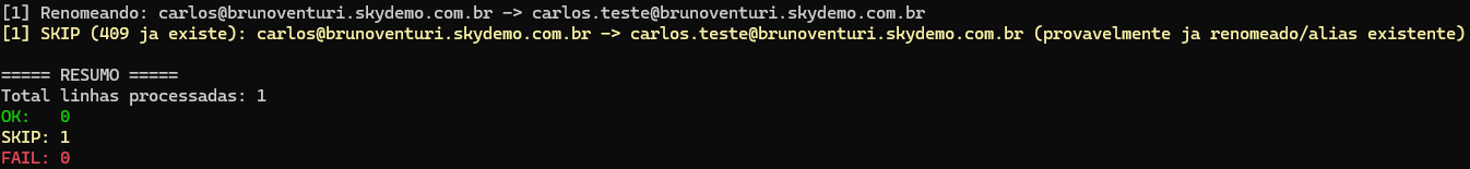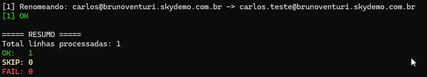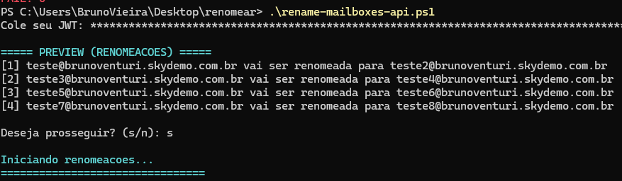 Este script em PowerShell realiza a renomeação de contas de e-mail na Skymail por meio da API.