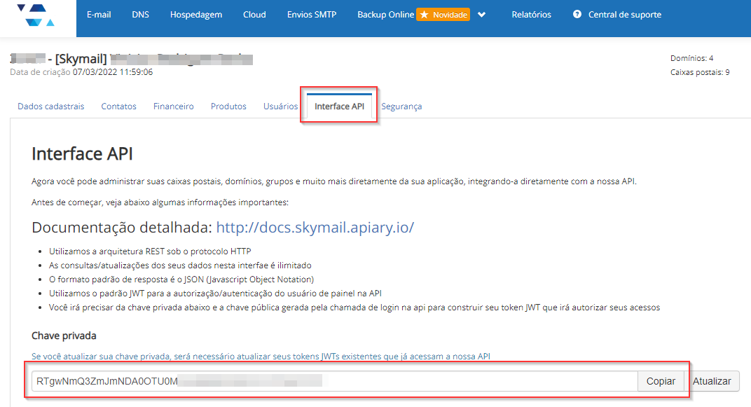 Em seguida, clique em Interface API e copie a chave privada da sua organização. Certifique-se de armazená-la em um local seguro.
