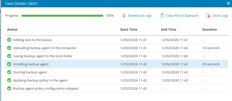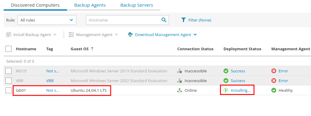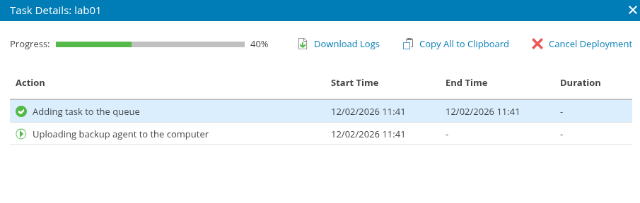 Após a instalação do Management Agent ser concluída, o deploy do Backup Agent é executado automaticamente pelo VAC (Painel Web):