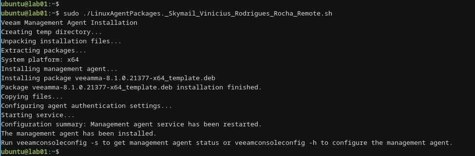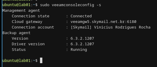 Podemos rodar o comando sudo veeamconsoleconfig -s para validar se os Agents estão ok, instalados e conectados: